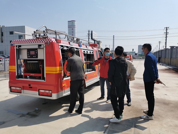 随后我们在10号车间参观了实车,车间人员现场为我们进行了水雾消防车打水试验,各销售精英纷纷拿出手机拍摄,并就水雾消防车提出了相关疑问,车间人员也进行了耐心、细致的讲解。
