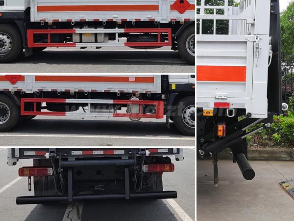 其它 | EBS系统型号:EBS 5;生产企业:克诺尔制动系统(大连)有限公司;安装有限速装置;限速装置限速(km/h):80;安装有具有卫星定位功能的行驶记录仪;随底盘选装尿素罐及油箱左右安装位置;选装箱体结构及后部结构;仅采用底盘4700,4800,5150mm轴距;选装不带起重尾板,尾板质量为550kg,起重尾板收起状态水平长度为290mm;该车选装ETC车载装置;发动机/油耗值(L/100km)对应关系为:F4.5NS6B220/26.28,YCS06245-60A/24.58,YCS04200-68/25.88;侧面防护及后下部防护装置材料材质:Q235,侧面防护连接方式:焊接连接;后下部防护装置连接方式:焊接加螺栓连接,断面尺寸(直径):Φ120mm,离地高度:500mm;选装不带尾板时,后下部防护装置断面尺寸(宽×高):60×120(mm),离地高度:470mm;运输独立容器(瓶)包装的货物;危险货物类项号:2.1,2.2;该车为危险品货物运输车;仅采用前轮盘式制动器,前置排气管,子午线轮胎;后轴为空气悬架;转向轮安装爆胎应急防护装置; | ||